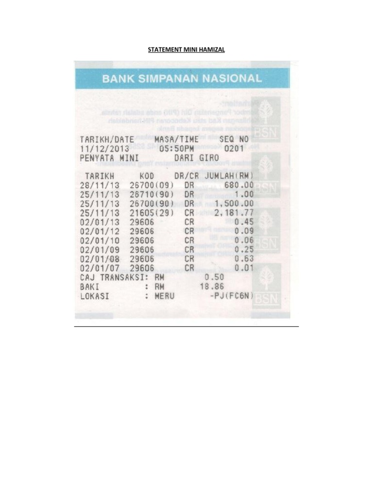 Anda perlu ke mana-mana mesin ATM BSN tetapi penyata kewangan yang dicetak adalah sekadar ringkas transaksi keluar masuk anda sahaja. Sila hantar SMS dengan. Sekiranya Anda ingin cetak penyata bank BSN secara lengkap berikut kami kongsikan langkah cara cetak penyata bank BSN melalui portal MyBSN.